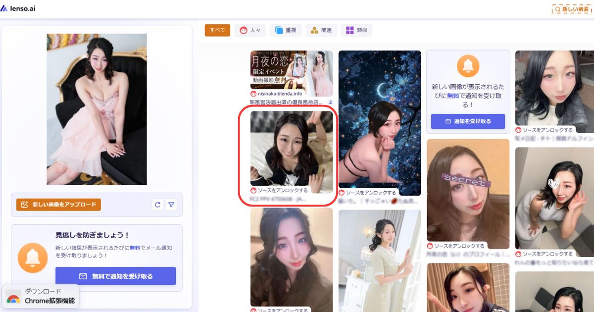 AIを活用したリバース画像検索で加工写真でも驚異的な一致度を得られる「Lenso.AI」では、在籍している風俗情報サイトの画像や、無修正AVのサムネイルがヒットします。